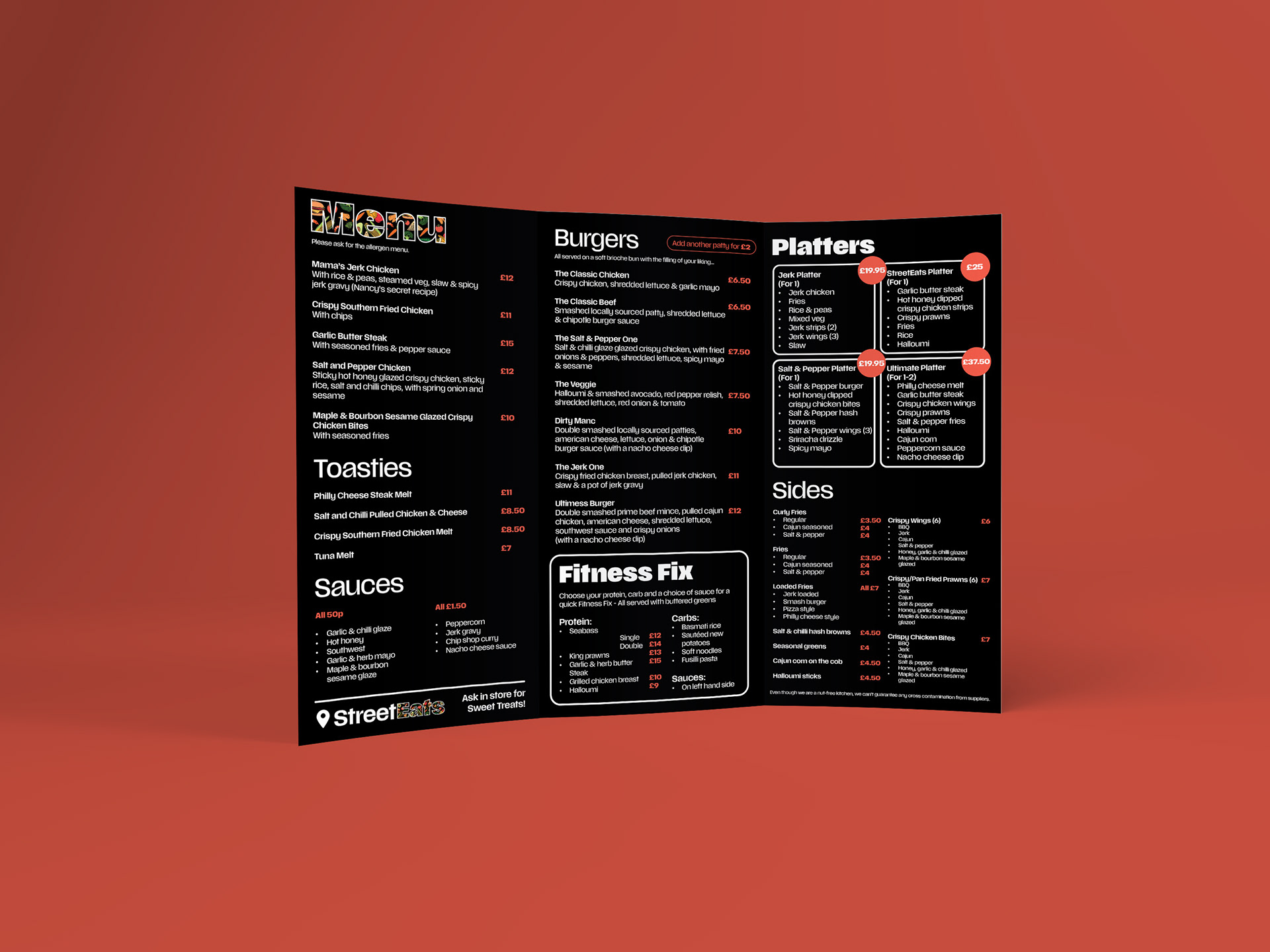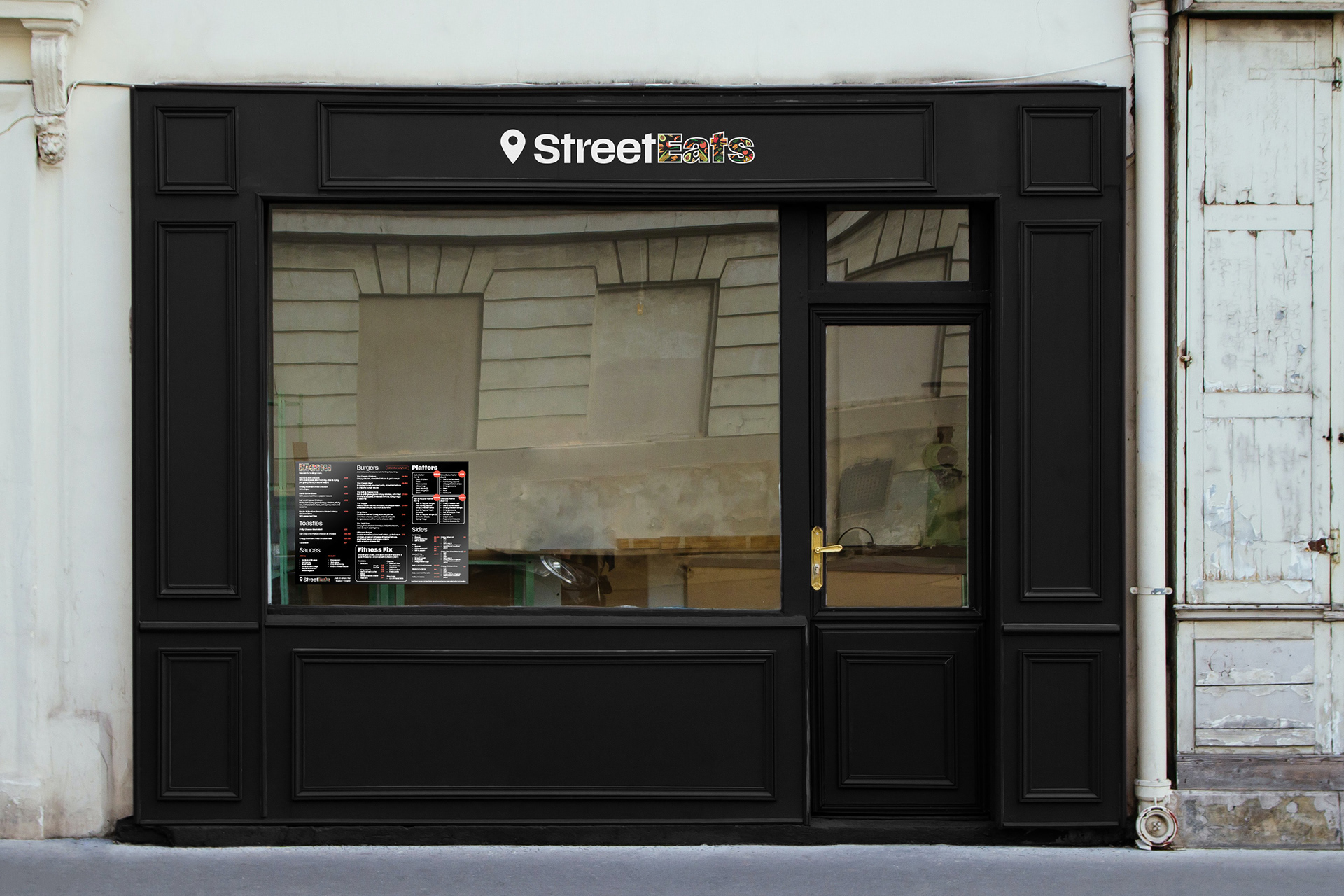 Current project developing a restaurants identity - serving street food, burgers and fitness fixes. Collateral created consists of signage, menu and apron/uniform. Social graphics to come as well as opening night photographs!